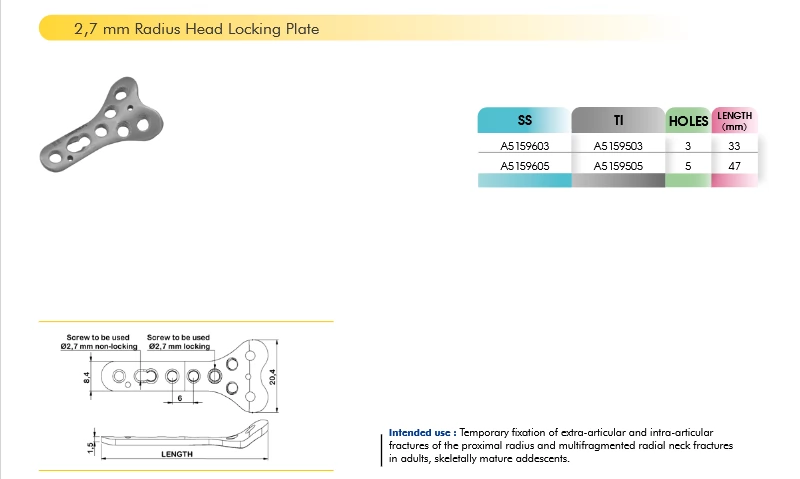 Kami adalah sole agent resmi untuk 2,7 mm Radius Head Locking Plate, implant ortopedi berkualitas tinggi yang dirancang untuk fiksasi fraktur kepala radius. Dengan sistem locking yang inovatif, plate ini memberikan stabilitas maksimal dan mempercepat proses penyembuhan pasien.